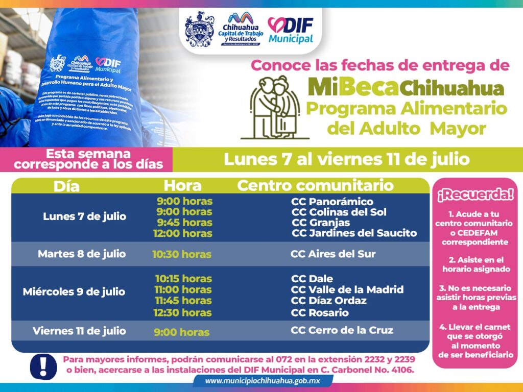 H. Ciudad de Chihuahua, Chih., a 06 de julio de 2025.- El Gobierno Municipal, a través del DIF, informa a las y los solicitantes del Programa Alimentario del Adulto Mayor (PAAM) los centros comunitarios y horarios en los que podrán acudir por su paquete alimentario del 7 al 11 de julio.