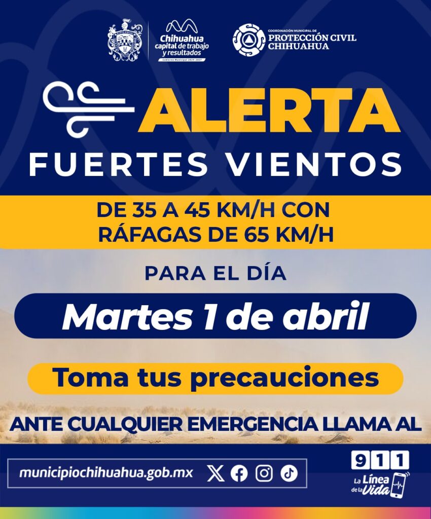 La Coordinación Municipal de Protección Civil informa que, para hoy martes se esperan ráfagas de viento de hasta 65 kilómetro por hora, y para el jueves y viernes alcanzarán los 55 kilómetros por hora.