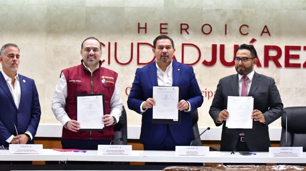 En la firma del convenio estuvieron el coordinador de directores, Enrique Licón Chávez; el director de Educación del Municipio, Guillermo Alvídrez; la directora de Desarrollo Económico, Tania Maldonado Garduño; la presidenta de la Cámara de la Industria de transformación, Isela Molina; el delegado de Canacar en Juárez, Alejandro González; el director de Canacar Zona Norte, Oscar Flores y el subdirector de enlace en Coahuila, Arturo Sotomayor.