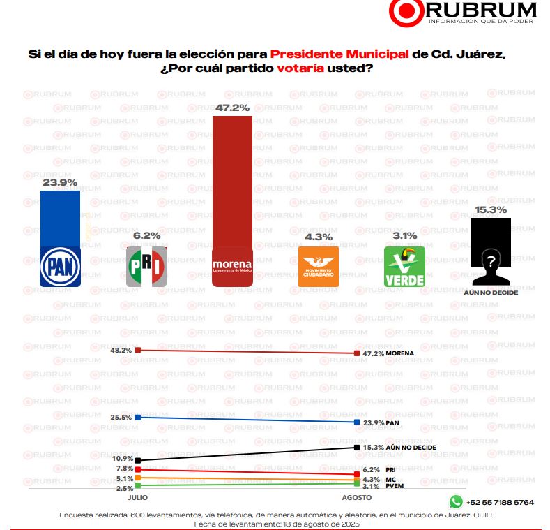 En la frontera, Morena encabeza con el 47 por ciento las preferencias electorales en la ciudad, superando al PAN que se ubica en segundo lugar con el 23 por ciento.