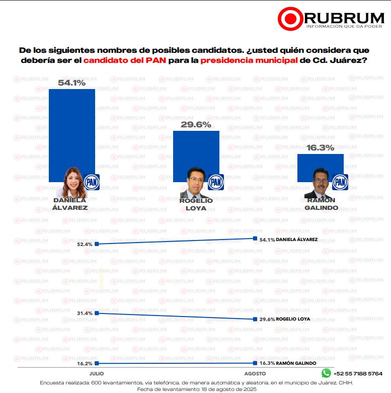 Por su parte, la mejor posicionada del PAN es Daniela Álvarez con el 54.1 por ciento, seguida por Rogelio Loya con el 29.6 por ciento y Ramón Galindo con el 16.3%.