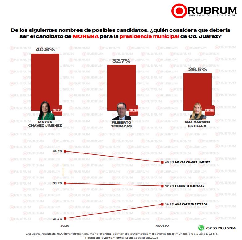 La mejor posicionada por MORENA es Mayra Chávez quien se ubica en primer lugar con el 40.8 por ciento, mientras que Filiberto Terrazas obtuvo el 32.7 % y Ana Carmen Estrada el 26.5%.