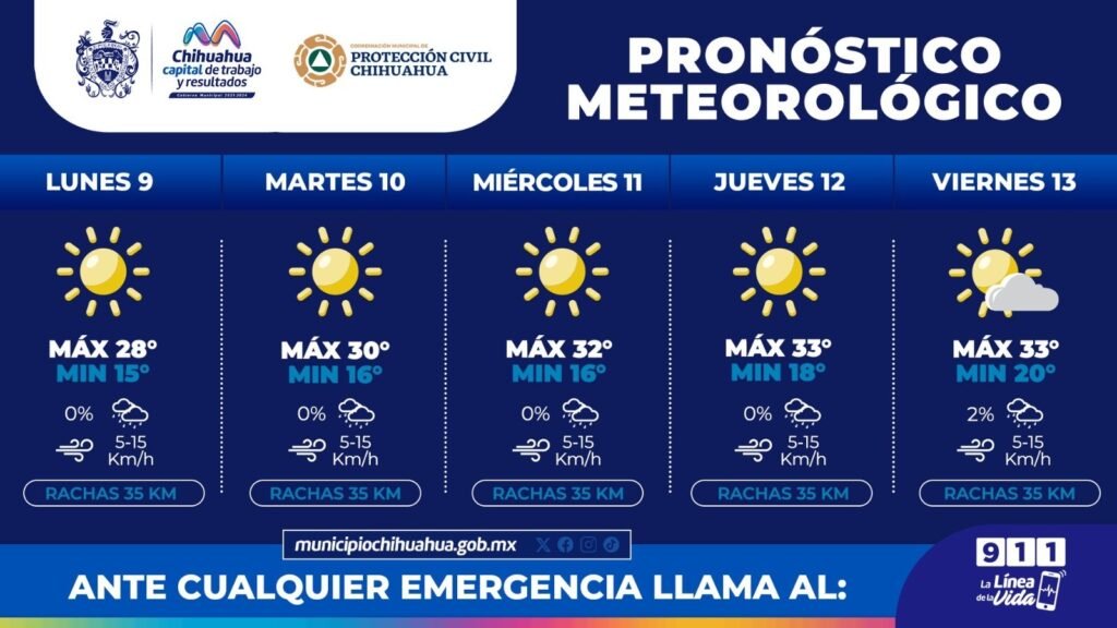 Chihuahua, Chih. A 09 de septiembre del 2024.- La Coordinación Municipal de Protección Civil, informa que, para esta semana del 09 al 13 de septiembre, se pronostican temperaturas máximas de 33°C con mínimas de 15°C.