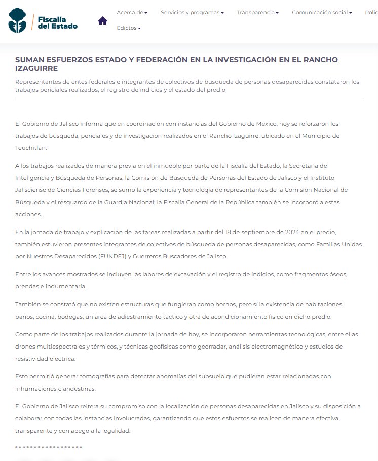 Asimismo, la dependencia estatal dijo que este jueves, en coordinación con instancias del Gobierno de México, se reforzaron los trabajos de búsqueda, periciales y de investigación realizados en el Rancho Izaguirre.