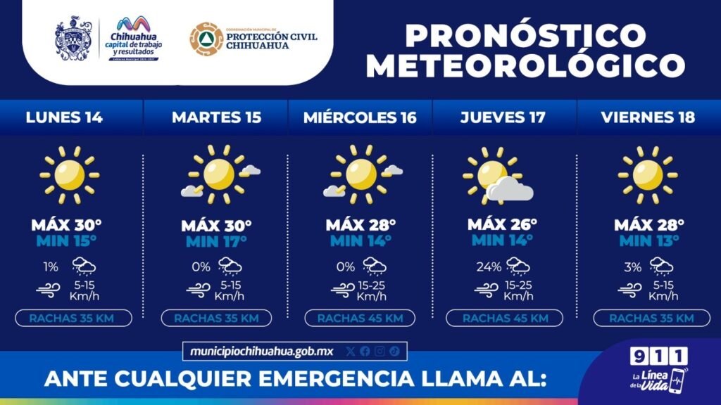 Chihuahua, Chih., a 13 de octubre del 2024.- La Coordinación Municipal de Protección Civil, exhorta a cuidarse por los cambios en las temperaturas, ya que se prevén días cálidos y noches frescas en la semana del 14 al 18 de octubre.