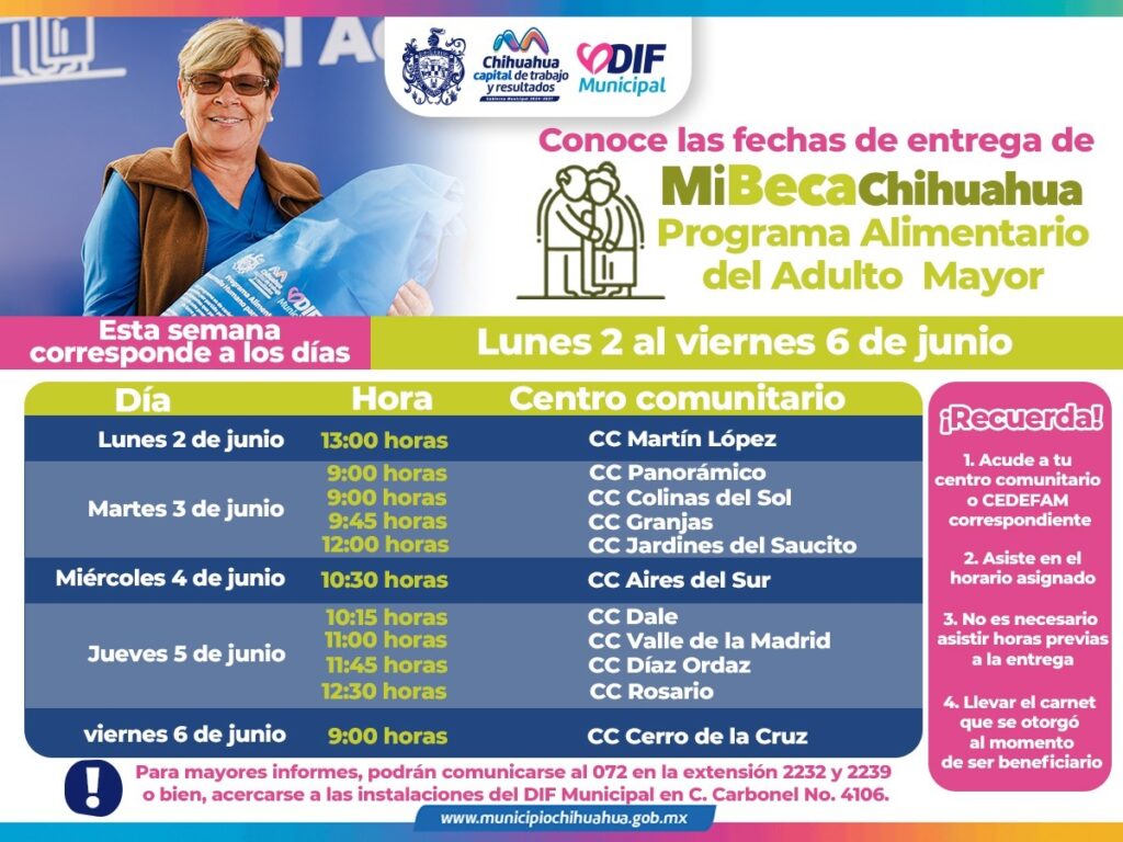 En atención al compromiso que el Gobierno Municipal tiene con las y los adultos mayores de Chihuahua Capital, para garantizarles una mejor calidad de vida, a través del DIF, se informa a las y los solicitantes del Programa Alimentario del Adulto Mayor (PAAM) los centros comunitarios y horarios en los que podrán acudir por su paquete alimentario del 02 al 06 de junio.