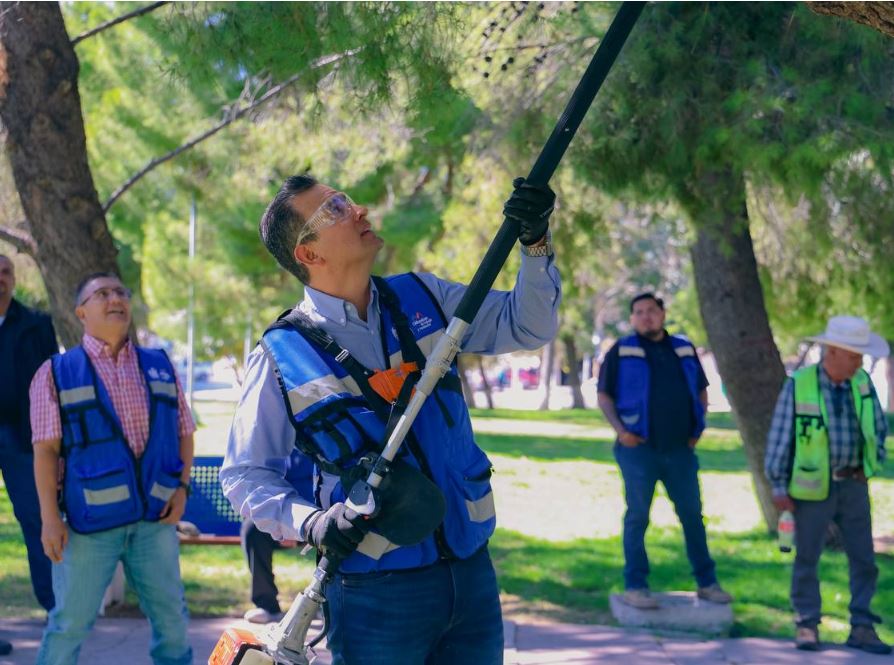 El alcalde Marco Bonilla, acudió al parque Platanito para supervisar labores de mantenimiento, espacio donde se sumó para preservar la imagen de esta zona tan visitada por familias chihuahuenses.