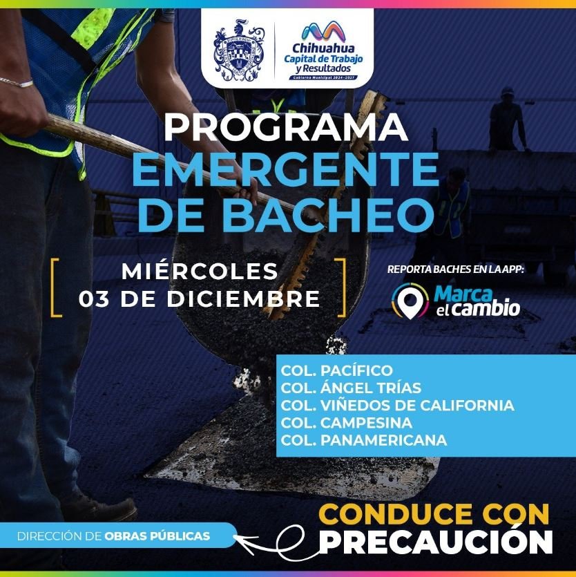 El Gobierno Municipal, a través de la Dirección de Obras Públicas, realizará trabajos de bacheo este miércoles 3 de diciembre, mediante el programa emergente en calles de las colonias: Pacífico, Ángel Trías, Viñedos de California, Campesina y Panamericana.