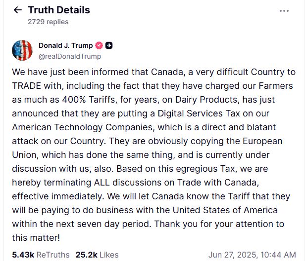 Trump informó que, como respuesta a esta política fiscal, ordenó el fin de los diálogos comerciales entre ambos países, decisión que tiene efecto inmediato y advirtió que en los próximos días anunciará nuevas medidas arancelarias contra Canadá.