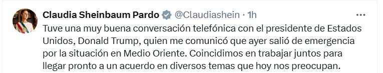 También explicó que Trump le informó que ayer dejó de emergencia la cumbre del G7 en Canadá por la situación en Medio Oriente, después de que las tensiones entre Israel e Irán aumentarán tras los ataques israelíes sobre Teherán.